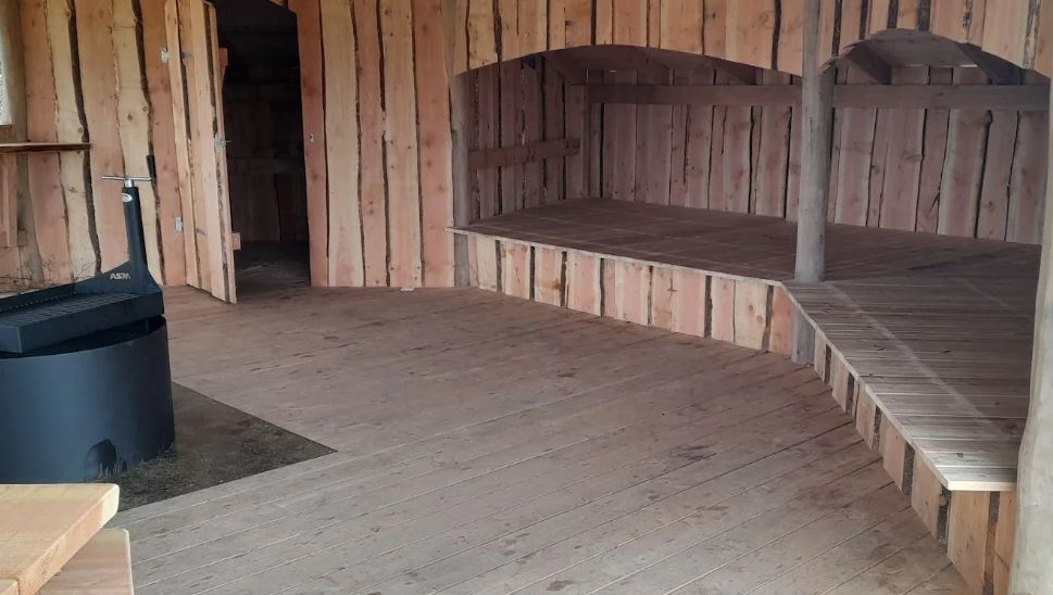 Overnatning: To shelters bygget direkte ind i bålhytten – optimal beskyttelse mod vejr og vind.